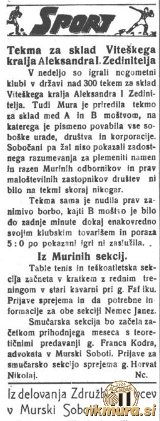 V nedeljo, 6. 10. 1935 so igrali nogometni klubi v državi čez 300 tekem za sklad Viteškega kralja Aleksandra I Zedinitelja. Sklad je nastal po smrti kralja, 9. oktobra 1934. Prejšnje leto je bila tekma med Muro in Panonijo in ker je Panonija letos prenehala z delovanjem, sta se pomerili ekipi Mura A in Mura B.