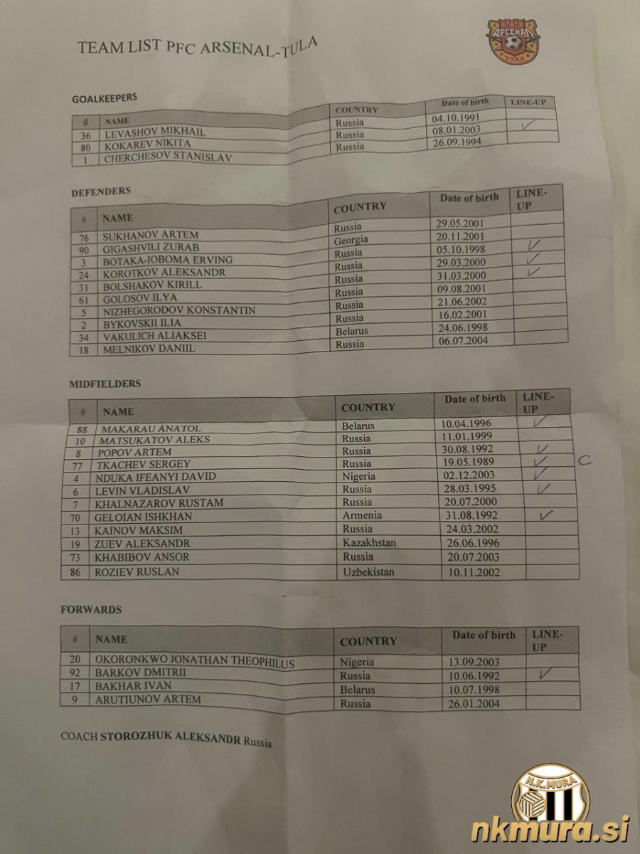Arsenal Tula: Nikita Kokarev, Erving Botaka Ioboma, Aleksandr Korotkov, Kirill Bolshakov, Anatol Makarau, Artem Popov, Sergey Tkachev, David Ifeandyi Nduka, Vladislav Levin, Ishkham Geloian in Dmitri Barkov. Trener: Aleksandr Storozhuk.