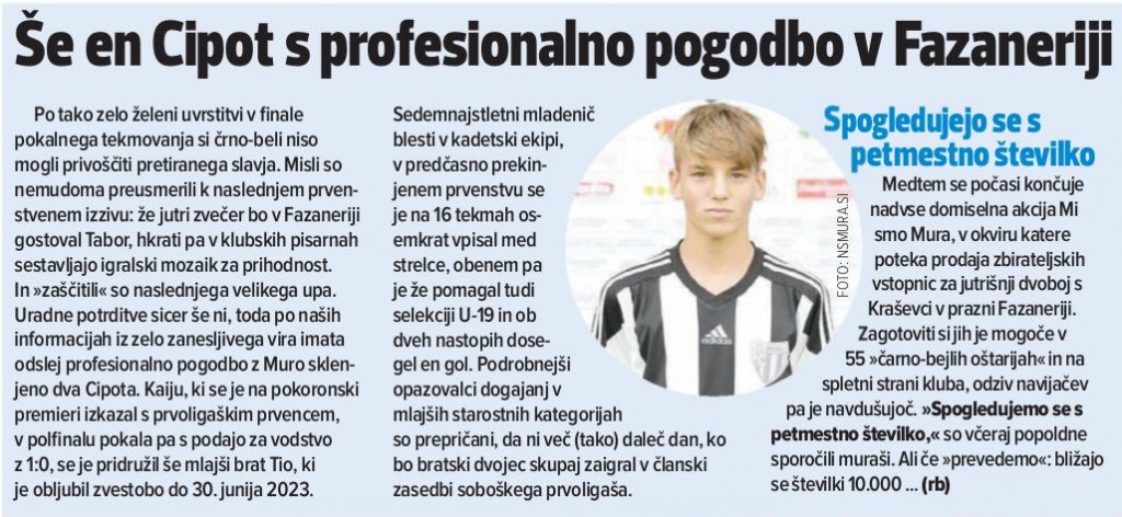 Z Muro je prvo profesionalno pogodbo podpisal Tio Cipot. Tio je brat Kaia Cipota in sin Fabijana Cipota. Pogodbo je podpisal do 30. junija 2023.