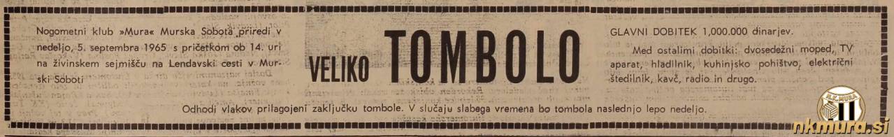 Nogometni klub Mura je v nedeljo, 5. septembra 1965, ob 14.00 priredil tradicionalno tombolo. Potekala je na živinskem sejmišču na Lendavski cesti v Murski Soboti.