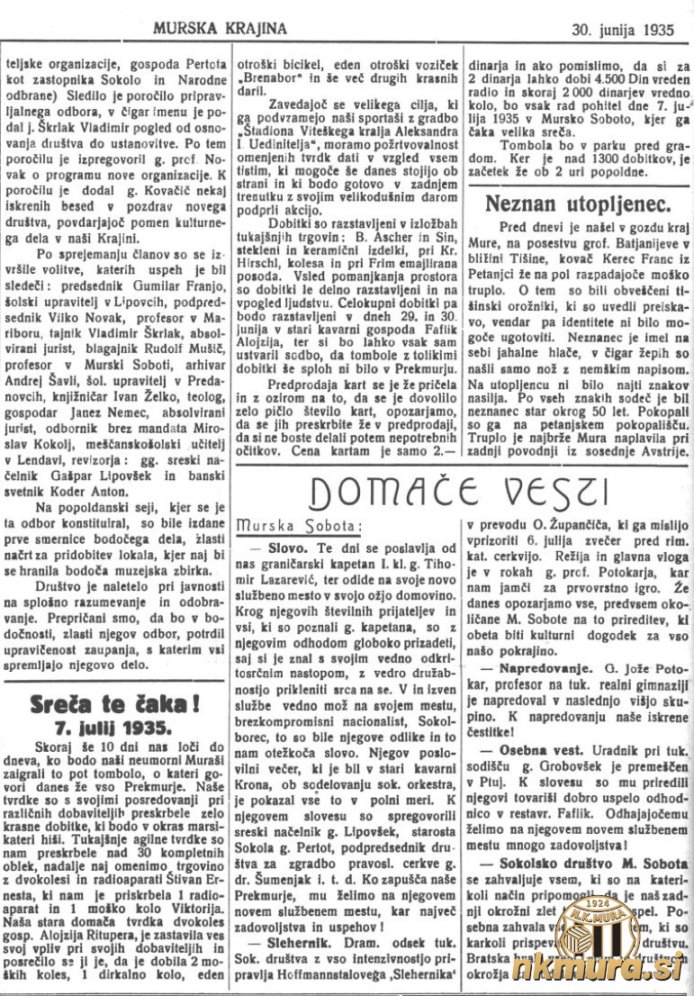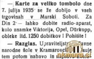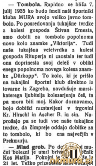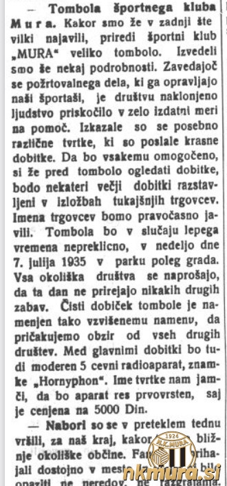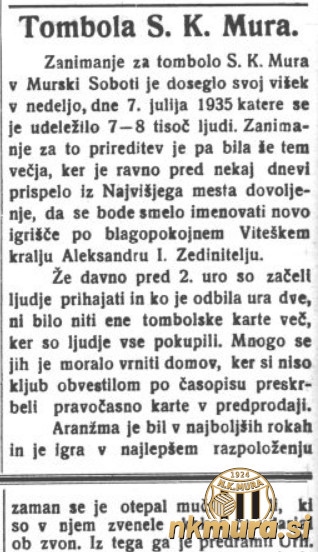 Tombola Mure je bila največja tombola, ki je bila do takrat organizirana in obiskana v naših krajih. Za njo se je potrebno zahvaliti trgovcem, ki so posredno in neposredno pripomogli klubu s svojimi darili. S to prireditvijo bo klub lahko uresničil svoje dolgoletne želje - igranje na lastnem igrišču. V času organizacije tombole so bila na igrišču že izvedena težja gradbena dela, še leta 1935 pa bodo pričeli z gradnjo tribune.