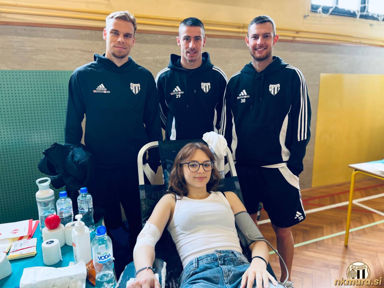 Aljaž Antolin, Dario Vizinger in Almin Kurtović z darovalko. Avtorske pravice: nkmura.si Foto: NŠ Mura