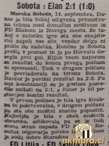 Na začetku je bila igra enakovredna, nakar so igralci Sobote počasi prevzeli pobudo in prek Janeza Horvata povedli z 1:0. Tudi v drugem polčasu je Sobota prevladovala, Bavčar pa je povišal na 2:0. Kasneje so gostje po lepi kombinaciji znižali na 2:1.