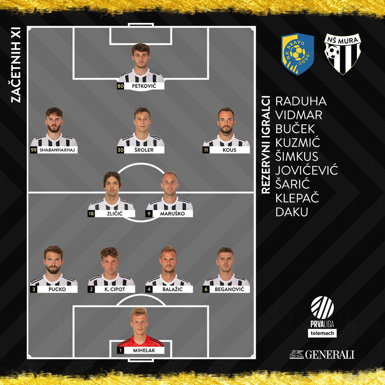 Pri Muri sta se po prestani kazni zaradi kartonov v moštvo vrnila Balažic in Shabanhaxhaj, nekoliko presenetljivo pa je na klopi obsedel prvi strelec moštva Mirlind Daku. Črno-beli so igrali v postavitvi 4-2-3-1. Branilski par sta sestavljala Balažic in Cipot, levi bočni je bil Pucko, desni pa Beganović. Na položaju zadnjega veznega sta igrala Maruško in Zličić. Desno krilo je bilo tokrat rezervirano za Kousa, levo pa za Shabanhaxhaja. Za napadalcem Petkovićem je igral Šroler. Tudi Bravo, ki se je na prejšnjih tekmah z Muro predstavil s tremi branilci, je tokrat igral s štirimi zadaj.