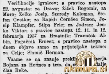 V teh so bili za Muro verificirani trije novi igralci in sicer: Josip Zelko, Koloman Szeredy in Štefan Cvetko. Vsi trije imajo pravico nastopa 22. avgusta 1936.