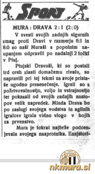 Drava je relativno mlad klub, Mura se je doslej s tem klubom pomerila trikrat in vselej zmagala, zato je bila tokratna zmaga Mure pričakovana. Je pa Mura do nje prišla precej težje kot na prejšnjih tekmah. Črno-beli so igrali precej raztrgano, najbolj razpoložena pa je bila obramba na čelu z Videnškom in vratarjem Kosom. Igrišče Drave je bilo razmočeno in ni omogočalo igre po tleh, saj je blato kot po pravilu ustavljalo žogo. Muraši pa so ravno na tej tekmi povečini igrali po tleh, kar se je izkazalo za napako.