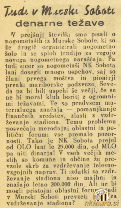 NK Sobota se, tako kot precej ostalih klubov po Sloveniji, srečuje s finančnimi težavami, ki se kažejo zlasti v vzdrževanju stadiona. Temu problemu posvečajo merodajni oblastni in politični forumi vse premalo pozornosti. Tako je NK Sobota v preteklem letu od Občinskega ljudskega odbora (OLO) prejela le 25.000 dinarjev od MLO-ja pa niti dinarja.