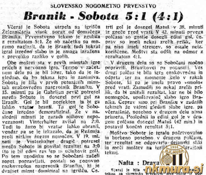 Sobota je v 11. krogu slovenske lige gostovala v Mariboru kjer se je pomerila s prvouvrščenim Branikom. Sobočani so tekmo zapustili sklonjenih glav, saj so izgubili s 5:1 (4:1). Glede na prikazano je poraz nekoliko previsok.