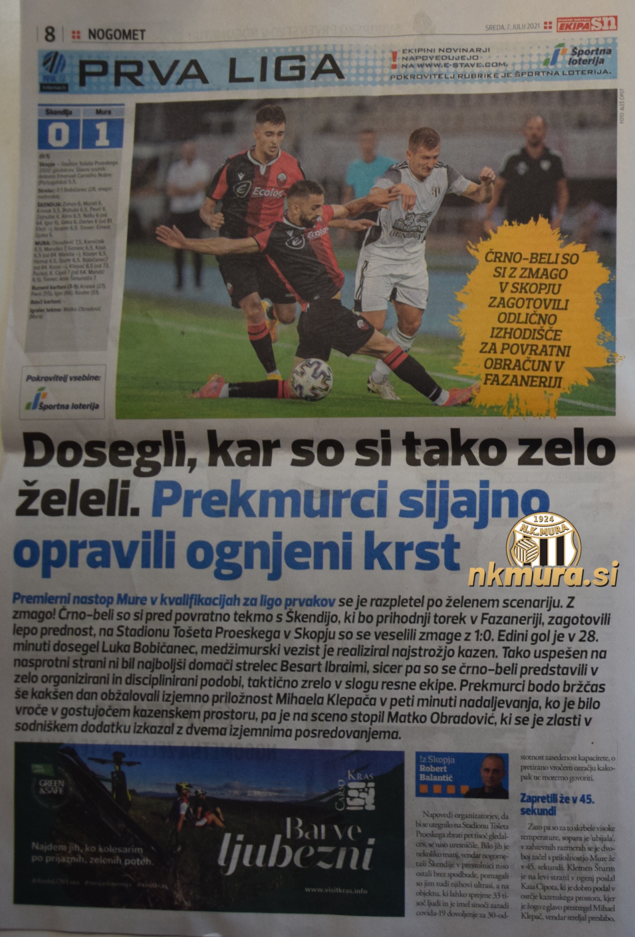 Nogometaši Mure so krstni nastop v kvalifikacijah za Ligo prvakov opravili z odliko. V glavnem mestu Severne Makedonije Skopju, so se pomerili s Shkëndijo in zmagali z 0:1 (0:1). S tem so naredili velik korak k napredovanju v 2. krog. V torek, 13. julija jih čaka še povratna tekma na Fazaneriji.