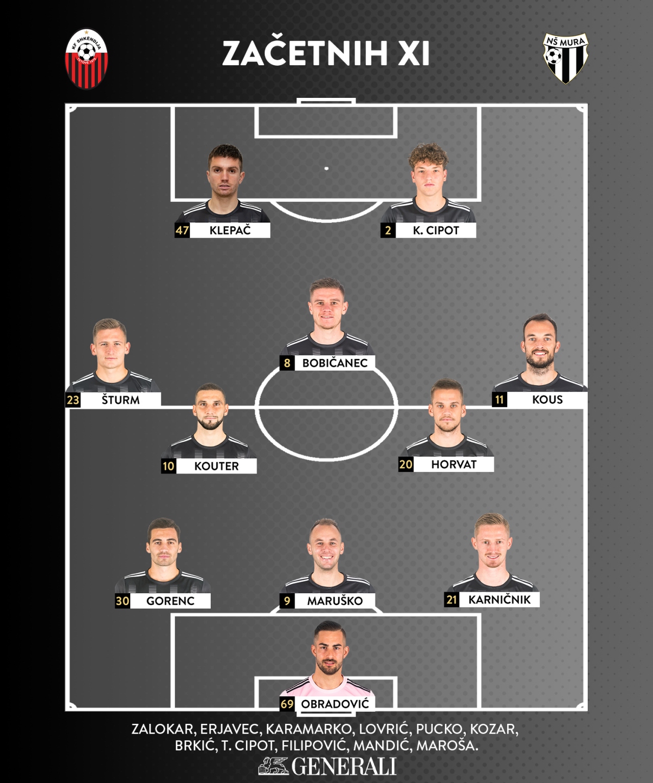 Ante Šimundža ni presenetil s postavo in je sestavil pričakovano enajsterico v postavitvi 3-5-2. Obradović, K. Cipot (od 64. Mandić), Bobičanec (od 84. Kozar), Maruško, Kouter, Kous (od 84. Maroša), Horvat, Karničnik, Šturm, Gorenc, Klepač (od 73. Pucko).