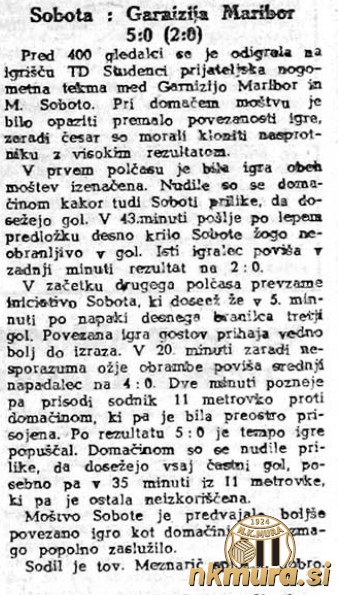 Po zmagi nad Kladivarjem v pokala maršala Tita, so se nogometaši Mure odpravili v Maribor, kjer so se v prijateljski tekmi pomerili z moštvom garnizije Maribor. Sobota je zmagala z 0:5 (0:2).