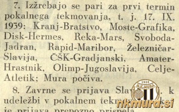 Ljubljanska nogometna podzveza je izžrebala pare 1. kroga pokala LNP za sezono 1939/1940. Mura je v 1. krogu prosta in se bo tekmovanju priključila v naslednjem krogu.