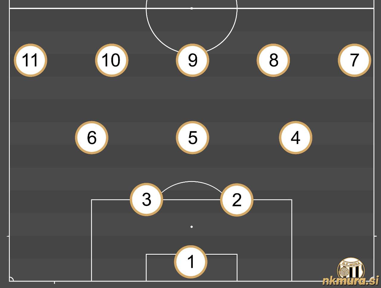 Nogometaši Mure so na začetku igrali v sistemu s petimi napadalci 2-3-5. Postavitev na zgornji sliki je bila uporabljena 17. maja 1925 na tekmi Čakovec : Mura.
