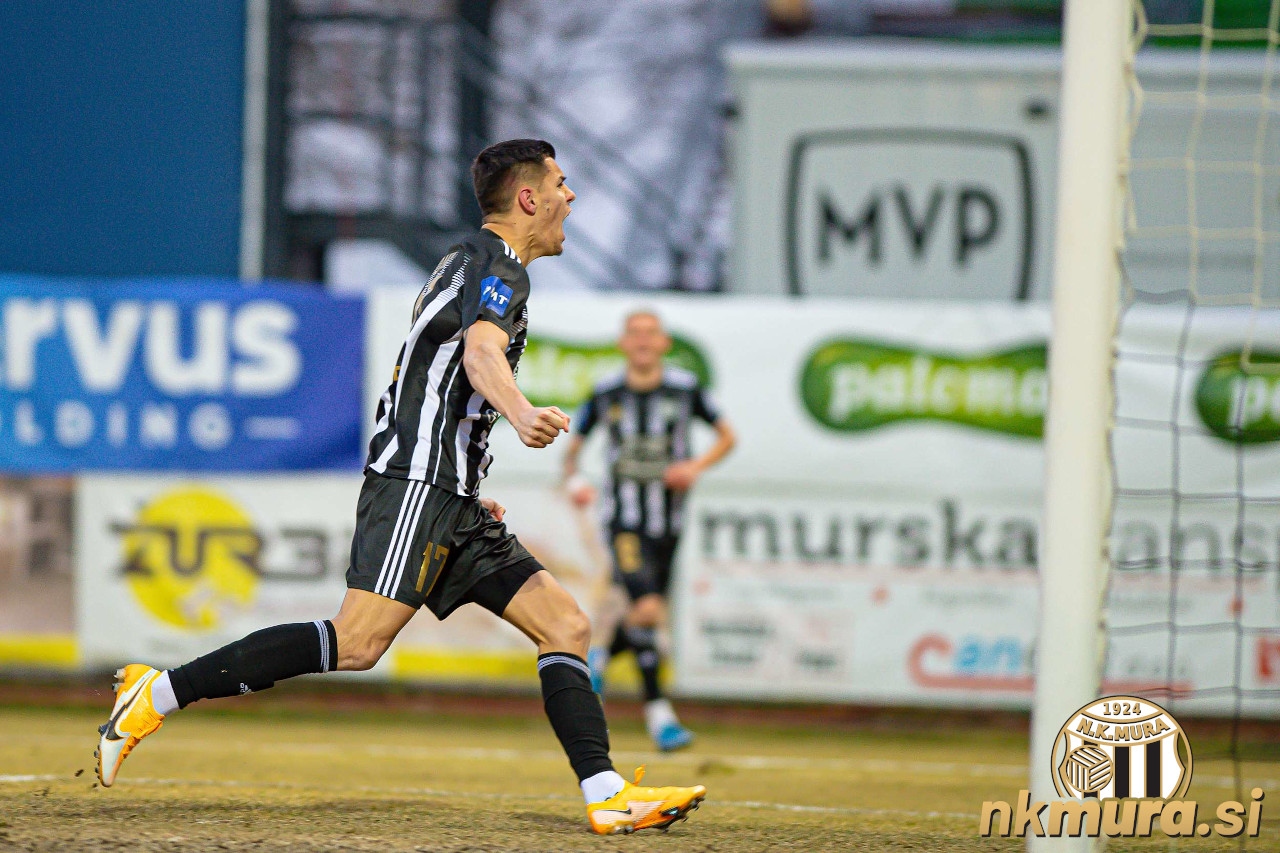 Mirlind Daku se veseli prvenca v dresu Mure. Prvi je načel mrežo Olimpije na derbiju 10. marca 2022. Avtorske pravice: nkmura.si Foto: Aleš Cipot/fotolens.si