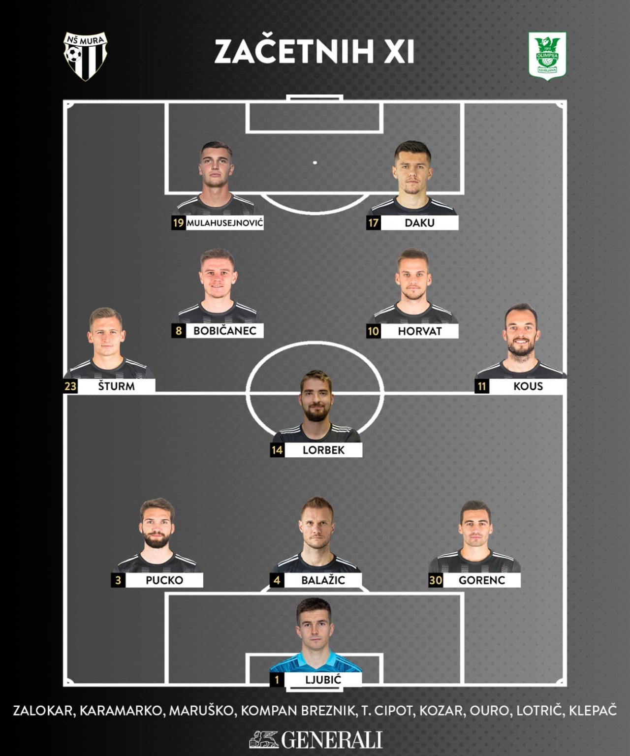 Mura: Ljubić, Pucko, Balažic, Bobičanec (od 86. Karamarko), Horvat (od 62. Ouro), Kous, Lorbek, Daku, Mulahusejnović (od 76. Kozar), Šturm (od 87. Lotrič), Gorenc. Trener: Damir Čontala.