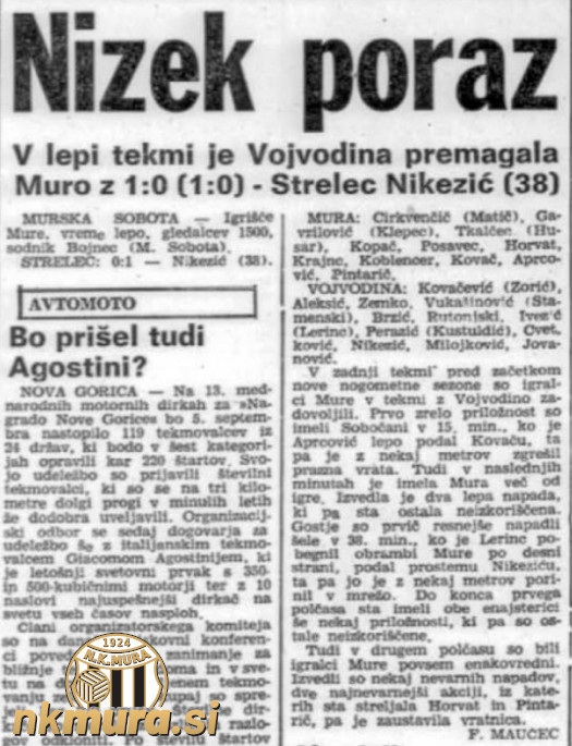 V zadnji pripravljalni tekmi pred novo sezono 1971/72, sta se v Murski Soboti pomerila Mura in Vojvodina. V lepi tekmi so zmagali gostje z 0:1. Končni rezultat je bil dosežen že v prvem polčasu.