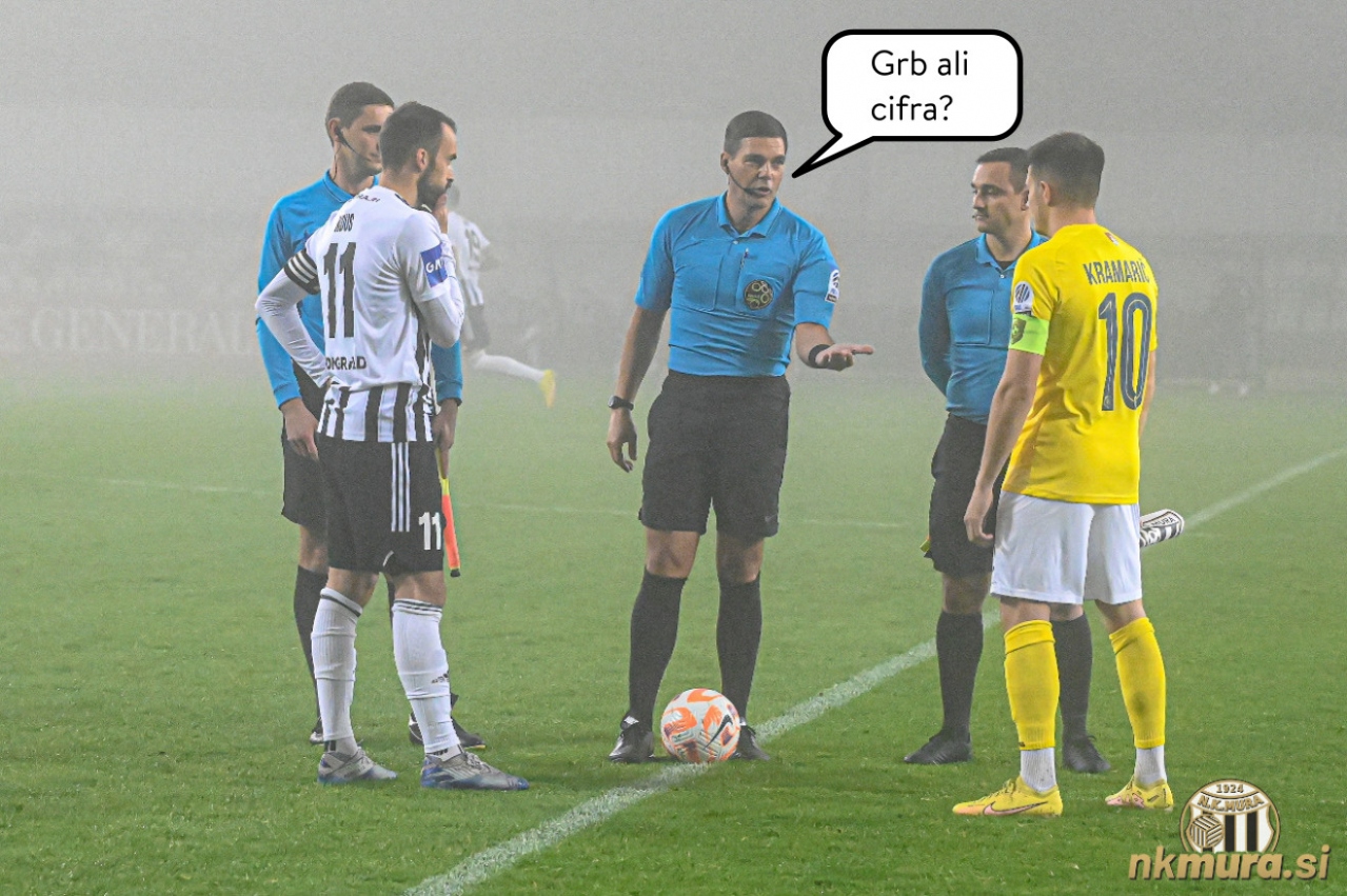 Glavni sodnik Roberto Ponis je namesto, da bi že na začetku prekinil tekmo oba kapetana vprašal "grb" ali "cifra"? Avtorske pravice: nkmura.si Foto: Loris Cipot, montaža nkmura.si