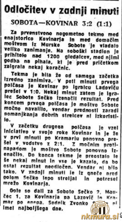 Tekma je bila že od začetnega sodniškega žvižga izredno zanimiva. Gostje so z zadetkom Lazoviča povedli v 5. minuti. Nekaj minut zatem je Sečko izid izenačil na 1:1. Pred koncem prvega polčasa so naši nogometaši pritisnili na vrata Kovinarja, vendar se rezultat ni več spremenil. V začetku drugega polčasa je iniciativo prevzel Kovinar in v 46. minuti povedel z zadetkom Kramarja. Kmalu zatem so vajeti igre v svoje noge znova vzeli nogometaši Sobote in z zadetkom Maučeca izenačili na 2:2. Ko je že vse kazalo, da se bo tekma končala brez zmagovalca je v zadnji minuti Sečko iz gneče zadel za 3:2.