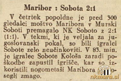 Nogometaši Sobote so se v četrtek popoldne pred 300 gledalci v pokalu maršala Tita pomerili z Mariborom. Štajerci so v Murski Soboti zmagali z 1:2 (1:1).