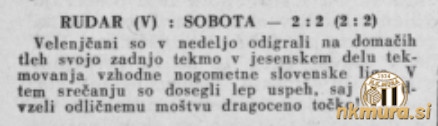 Nogometaši Sobote so v zaostali tekmi 1. kroga vzhodne skupine slovenske nogometne lige gostovali v Velenju in se z Rudarjem razšli 2:2. Končni rezultat je bil dosežen že ob polčasu. Tekma bi morala biti odigrana že 27. septembra, vendar je Sobota takrat igrala prijateljsko tekmo v Avstriji.