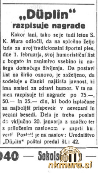 Vodstvo Mure se je odločilo, da tudi letos izda svoj humoristični časopis Düplin. Namenjen je zabavnim in humorističnim člankom iz domačega življenja. V ta namen je klub povabil vse zainteresirane, da časopis sooblikujejo s svojimi prispevki. Klub je razpisal tudi nagrade za najboljše prispevke in sicer 75, 50 in 25 dinarjev. Članke je potrebno poslati do vključno 20. januarja 1940 na naslov Uredništvo Düplin, poštni predal 42. Časopis bo izšel 1. februarja 1940 na tradicionalnem športnem plesu Mure, ki bo potekal pod geslom Planinska noč.