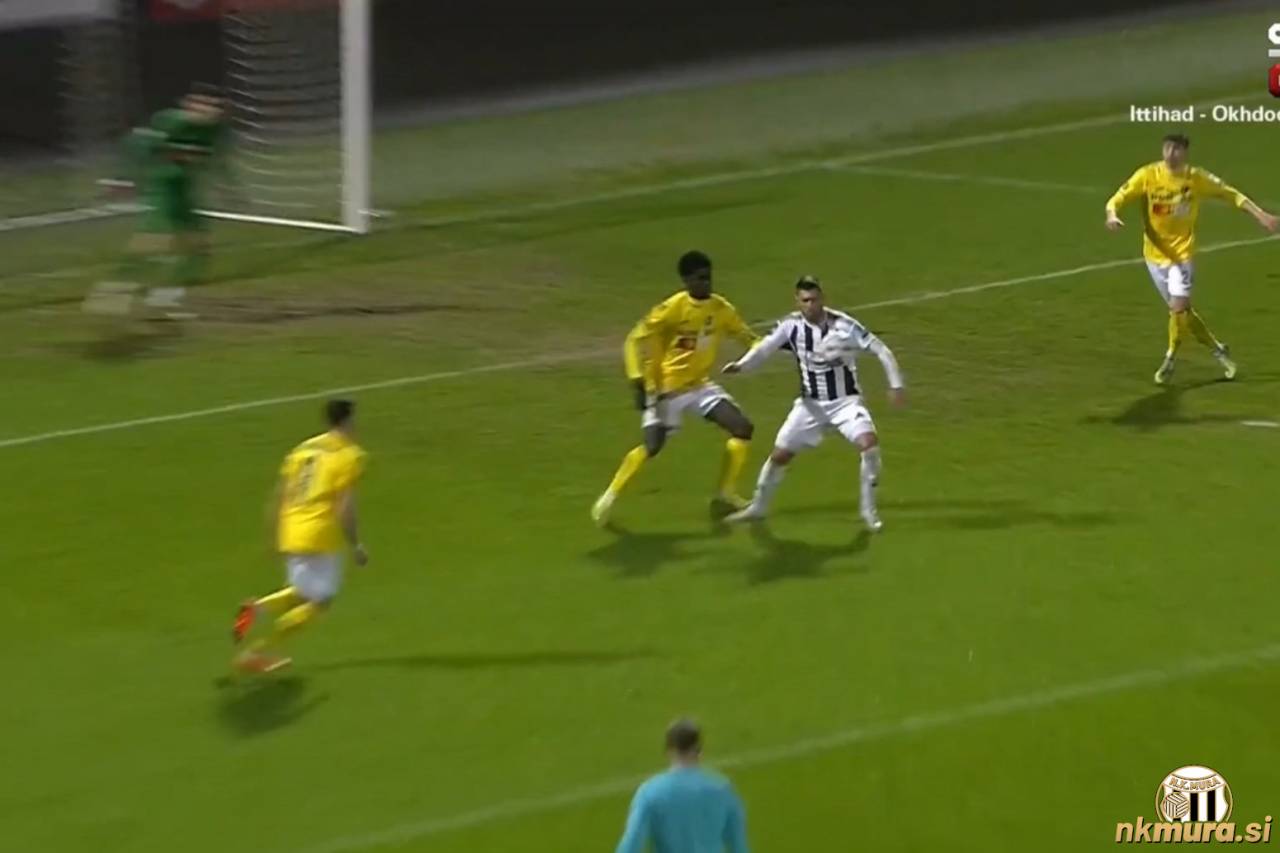 Branilec Brava N'guessan je pred očmi glavnega sodnika Davida Šmajca v 71. minuti v kazenskem prostoru pohodil Marošo. Ne glavni sodnik ne VAR sodniki niso zaznali prekrška. Avtorske pravice: nkmura.si Foto: zaslonski posnetek Sportklub