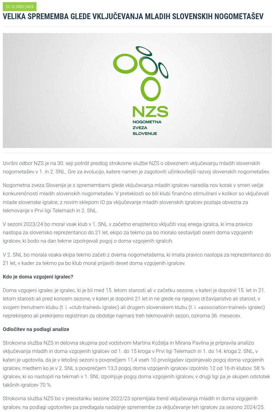 Nogometna zveza Slovenije je na svoji spletni strani 21. decembra tudi uradno objavila spremembo pravilnika, ki bo za klube v 1. SNL in 2. SNL veljal od sezone 2023/24.