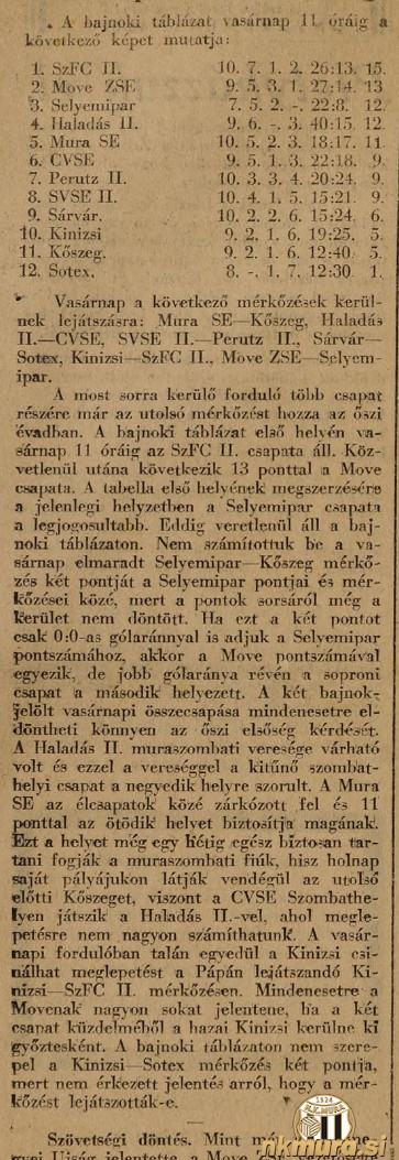 V predzadnjem krogu jesenskega dela prvenstva se je Mura na Fazaneriji pomerila z drugo ekipo Haladasa in zmagala s 4:2. Gostje so ob polčasu vodili z 0:1. Tekma je bila zelo zanimiva in kot poročajo mediji na nivoju lige NB III (Nemzeti Bajnokság III oz. 3. madžarska liga). Za Haladas je igralo kar nekaj igralcev z izkušnjami iz 1. in 2. madžarske lige, kot npr. Büki, Szalay, Lipovics, Tóth, Ujváry in Molnár.