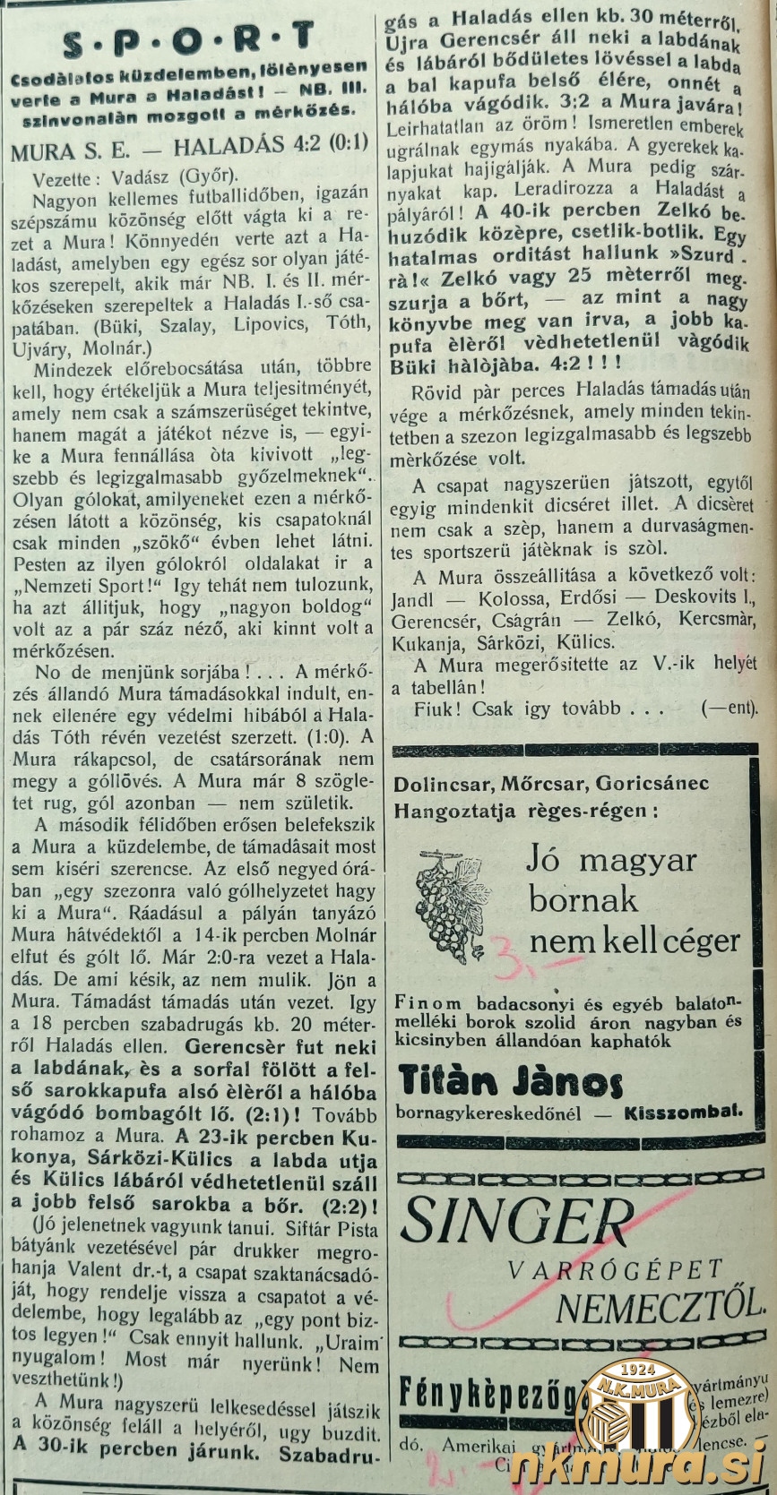 Mura je igrala v postavi: Jandl - Kološa, Erdősi - L. Deškovič, Gerenčer, Čagran - Zelko, Kerčmar, Kukanja, Sarközi in Külič. Trener: dr. Gusztav Valent