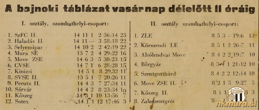 1. Szombathelyi II 14 11 1 2 36:14 23 2. Haladas II 14 11 0 3 58:18 22 3. Soproni Selyemipar SE 14 10 2 2 42:19 22 4. Mura 13 7 2 4 29:22 16 5. Zalaegerszegi SE 14 6 3 5 30:23 15 6. Celldömölki 14 7 1 6 28:28 15 7. Pápai MÁV 14 5 1 8 29:32 11 8. Soproni VSE II 13 5 1 7 20:26 11 9. Pápai Perutz II 14 4 3 7 27:34 11 10.Sárvári 14 4 2 8 23:34 10 11.Kőszegi 14 3 1 10 13:56 7 12.Soproni SoSE 14 1 1 12 17:46 3