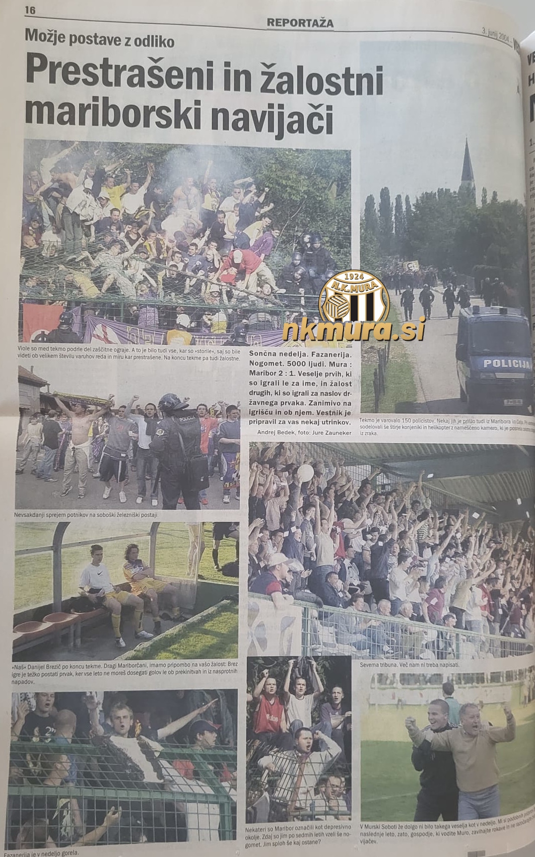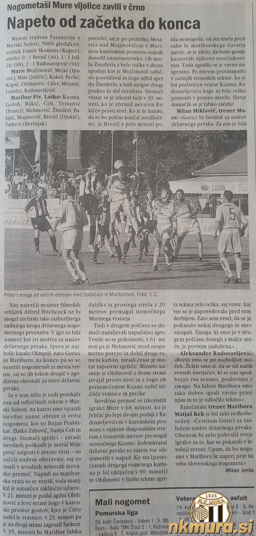Drugi polčas se je še vedno igralo na nož, Muraši pa so na vse pretege poskušali izid izenačiti. Najprej je Obilinovič, s prostega strela zadel stičišče vratnice in prečke. Nato pa je počilo. V igro je vstopil Žare (op. a: Jeličić), ter po petih minutah igre z diagonalnim strelom matiral nemočnega Kuzmo. Veselju ni bilo ne konca ne kraja, na jugu so zagorele bakle ... Nekaj minut pred tem so vijoličasti ostali še brez Mešanoviča, ki je dobil drugi rumen karton. Zadetek Jeličića je Mariborčane postavil v neugoden položaj, saj so potrebovali zmago. Tako se je odpiralo vse več prostora za hitre protinapade Mure. Odlični Rade (op. a.: Radosavljević) je tako ob koncu tekme Muri prinesel zmago. Veselje na eni in žalost na drugi strani.