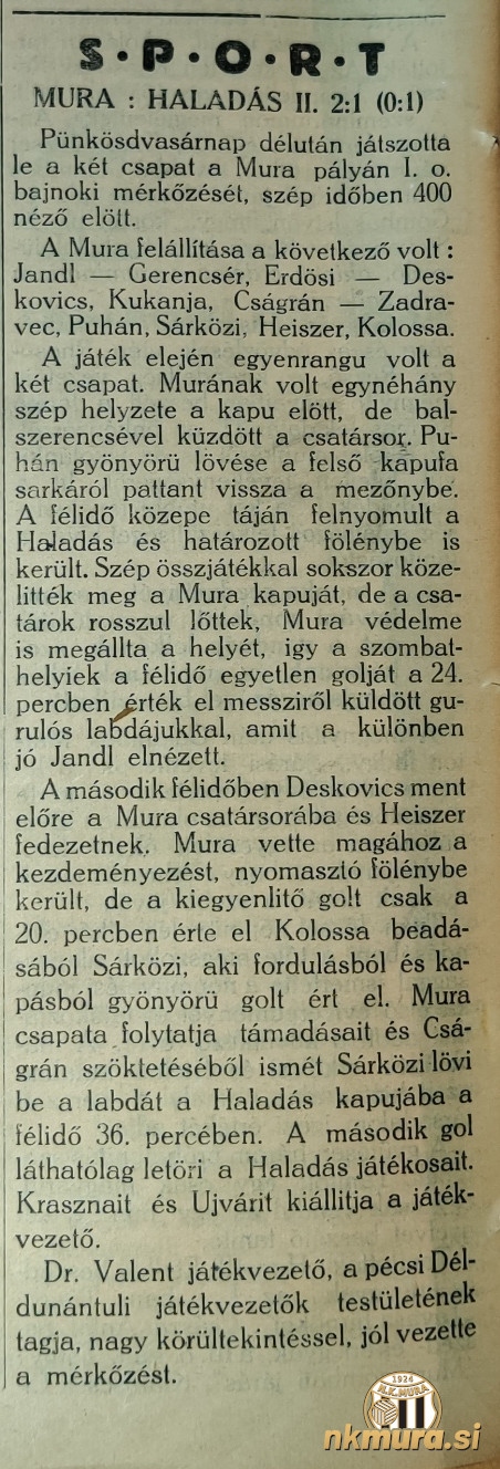 24. maja 1942 je Mura igrala zelo pomembno prvenstveno tekmo z drugo ekipo Haladasa in zmagala 2:1. Polčas so dobili gostje z 0:1.