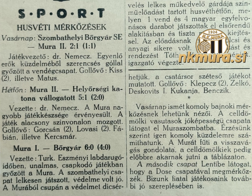 Na velikonočno nedeljo in ponedeljek, 9. in 10. aprila 1944, je Mura organizirala tri nogometne tekme. V nedeljo se je druga ekipa Mure pomerila z ekipo Szombathelyi Bőrgyár SE. Slavili so igralci iz Sombotela z 2:1 (1:1). Za Muro je zadetek dosegel Matuš.