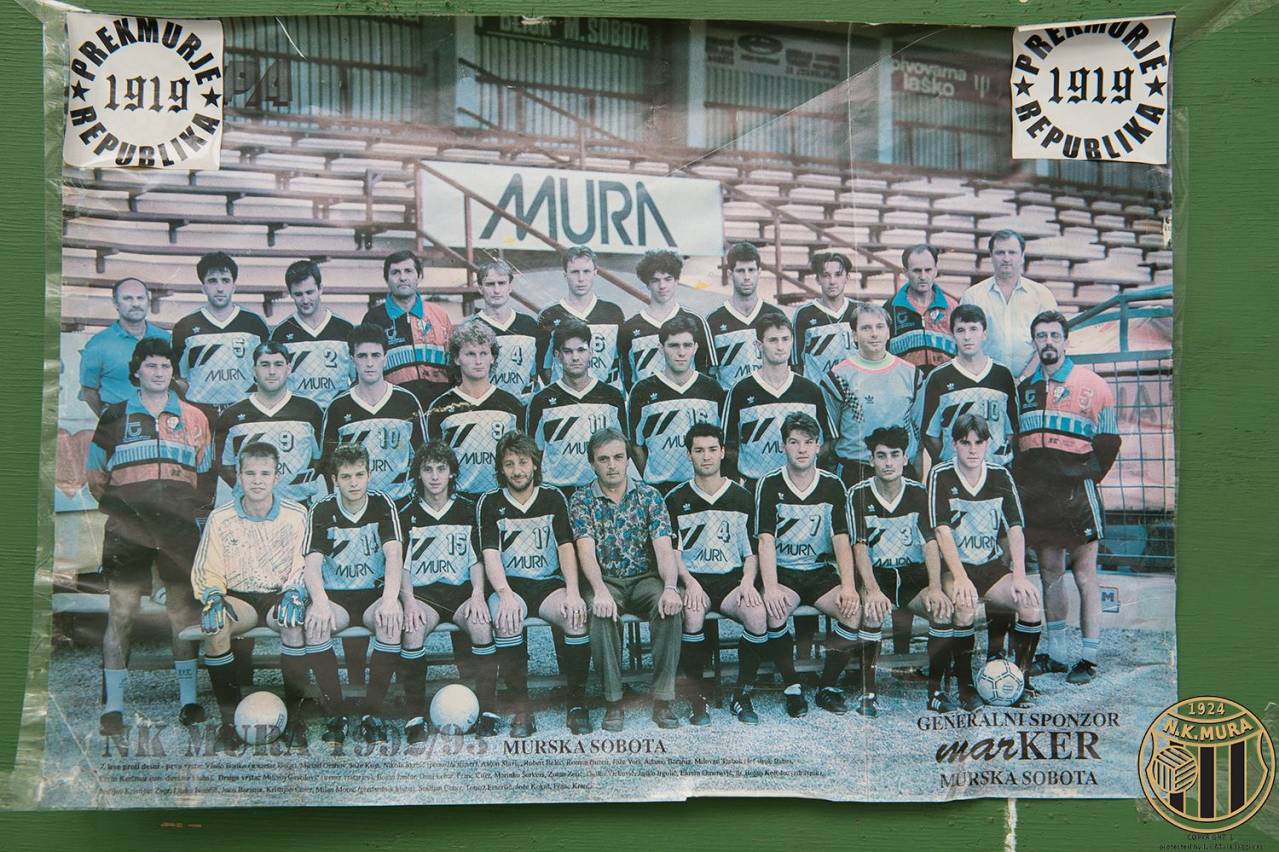 NK Mura v sezoni 92/93. Stojijo od leve: Vlado Banko (sekretar), Mirsad Granov, Jože Kosi, Nikola Škrbić (pomočnik trenerja), Anton Slavic, Robert Belec, Roman Buzeti, Jože Vori, Adamo Baranja, Milovan Tarbuk (trener), Ervin Kerčmar (teh. direktor). Srednja vrsta: Milivoj Gavrilović (trener vratarjev), Bojan Jančar, Daniel Lebar, Franc Cifer, Marinko Šarkezi, Zoran Zetić, Duško Vicković, Janko Irgolić, Ekrem Omerović, dr. Bojan Korošec (zdravnik). Spodnja vrsta: Kristjan Zver, Darko Ivančič, Joco Baranja, Kristjan Cener, Milan Mörec (predsednik), Smiljan Cener, Tomaž Emeršič, Jože Kokaš in Franc Krančič. Avtorske pravice: nkmura.si Foto: arhiv NK Mura skozi čas