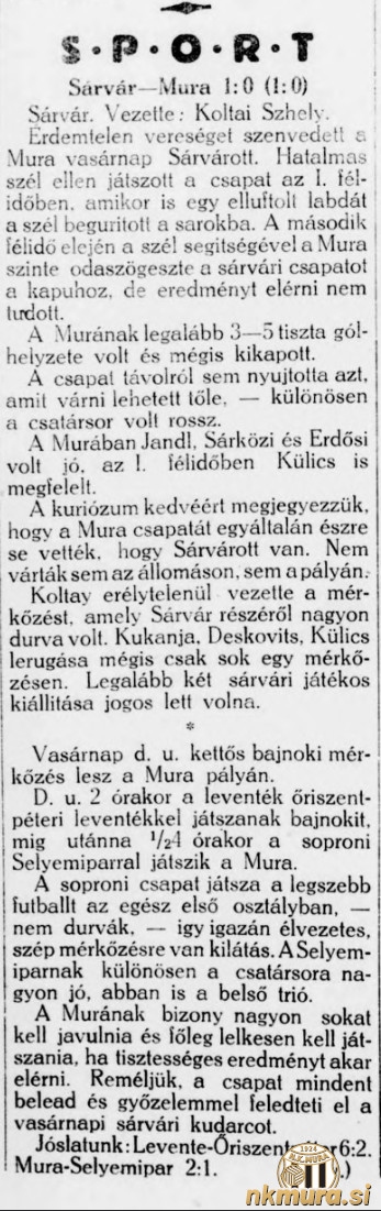 V 14. krogu prvenstva v sezoni 1942/43, je Mura gostovala v Sarvarju in doživela nepričakovan poraz z 1:0. Končni rezultat je bil dosežen že v prvem polčasu.