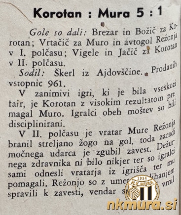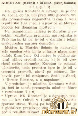 Nogometaši Mure so v prvem krogu prvenstva v sezoni 1951 gostovali v Kranju pri Korotanu in izgubili z visokih 5:1 (3:1).