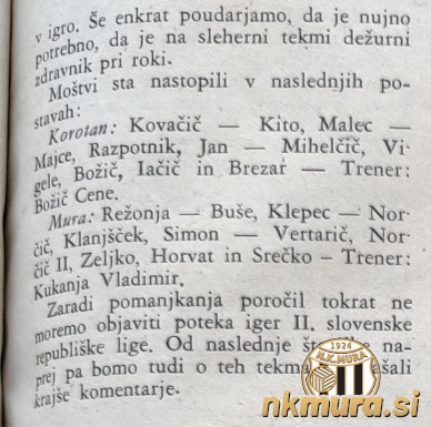 Mura: Režonja - Bušen, Klepec - A. Norčič, Klajnšček, Šimon - Vrtarič, B. Norčič, Zelko, Horvat in Sečko. Trener: Vladimir Kukanja.