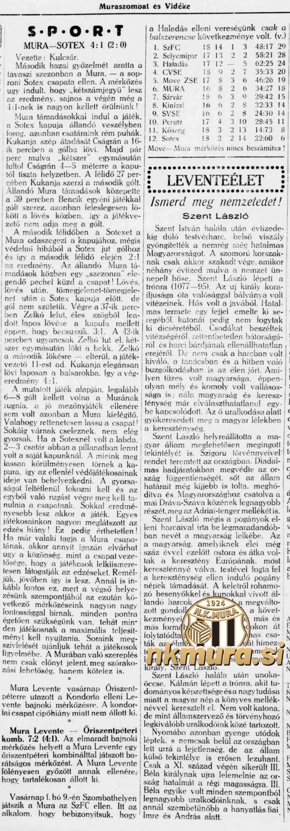 Nogometaši Mure so v 17. krogu prvenstva Sombotelske skupine I. razreda Severno podonavskega okrožja premagali Soproni Sotex s 4:1 (2:0) in dosegli drugo zmago v spomladanskem delu sezone. Glede na potek tekme je zmaga s 4:1 premala, kajti po priložnosti bi Mura lahko dosegla dvomestno število zadetkov.