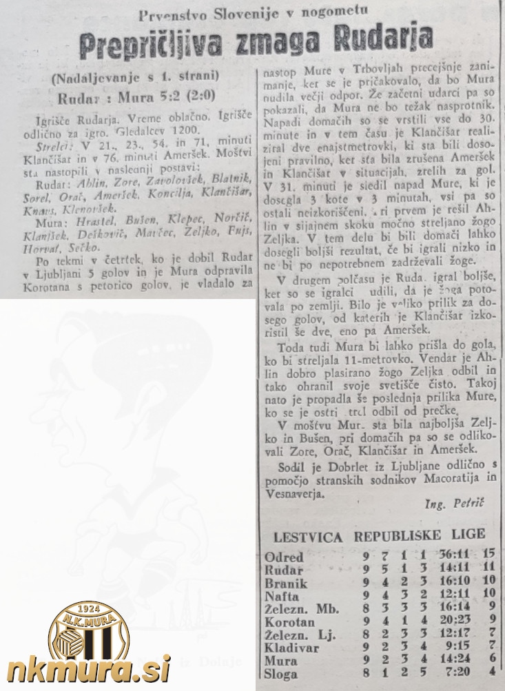 1. Odred 9 7 1 1 36:11 15 2. Rudar (T) 9 5 1 3 14:11 11 3. Branik 9 4 2 3 16:10 10 4. Nafta 9 4 3 2 12:11 10 5. Železničar MB 9 3 3 3 16:14 9 6. Korotan 9 4 1 4 20:23 9 7. Železničar LJ 8 2 3 3 12:16 9 8. Kladivar 9 2 3 4 9:15 7 9. Mura 9 2 2 5 14:24 6 10.Sloga 8 1 2 5 7:20 4