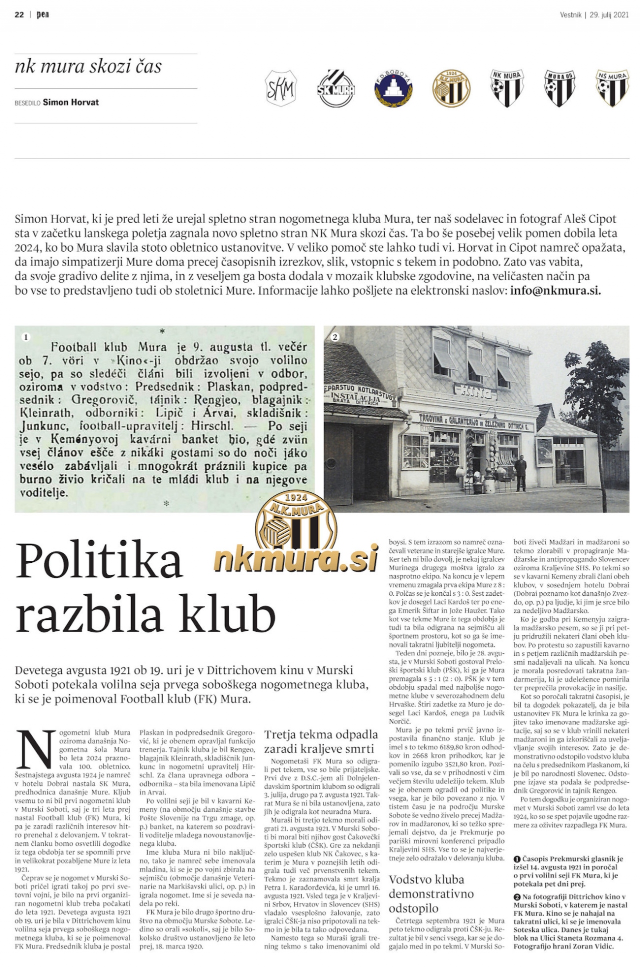 9. avgusta 1921 je bila v soboškem Kinu volilna seja Football kluba Mura. Predsednik je postal Vinko Plaskan, podpredsednik pa Mate Gregorovič, ki je opravljal funkcijo trenerja. Tajnik je bil Rengjeo, blagajnik Kleinrath, odbornika pa Lipič in Arvai. Skladiščnik je postal Junkunc, nogometni upravitelj pa Hirschl.