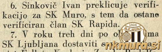 Vratar Ivan Sinkovič, ki je k Muri prestopil januarja 1937 iz mariborskega Rapida, se je odločil, da se vrne v svoj prejšnji klub. Njegovo prošnjo je obravnala Ljubljanska nogometna podzveza 7. septembra 1937.