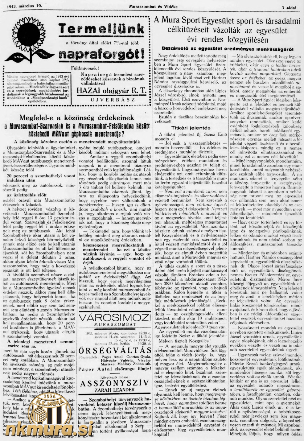 V soboto, 13. marca 1943 je ob osmih zvečer v gostilni Banfi potekal 19. redni letni občni zbor Mure. Minil je v znamenju okupacije Madžarske in poveličevanja domoljublja. Poročilo z občnega zbora je bilo objavljeno v propagandnem časopisu Muraszombat és vidéke, v nadaljevanju pa prinašamo povzetek iz omenjenega časopisa. Predsednik je znova postal Josip Lipič, ki je na čelu kluba že osem let.