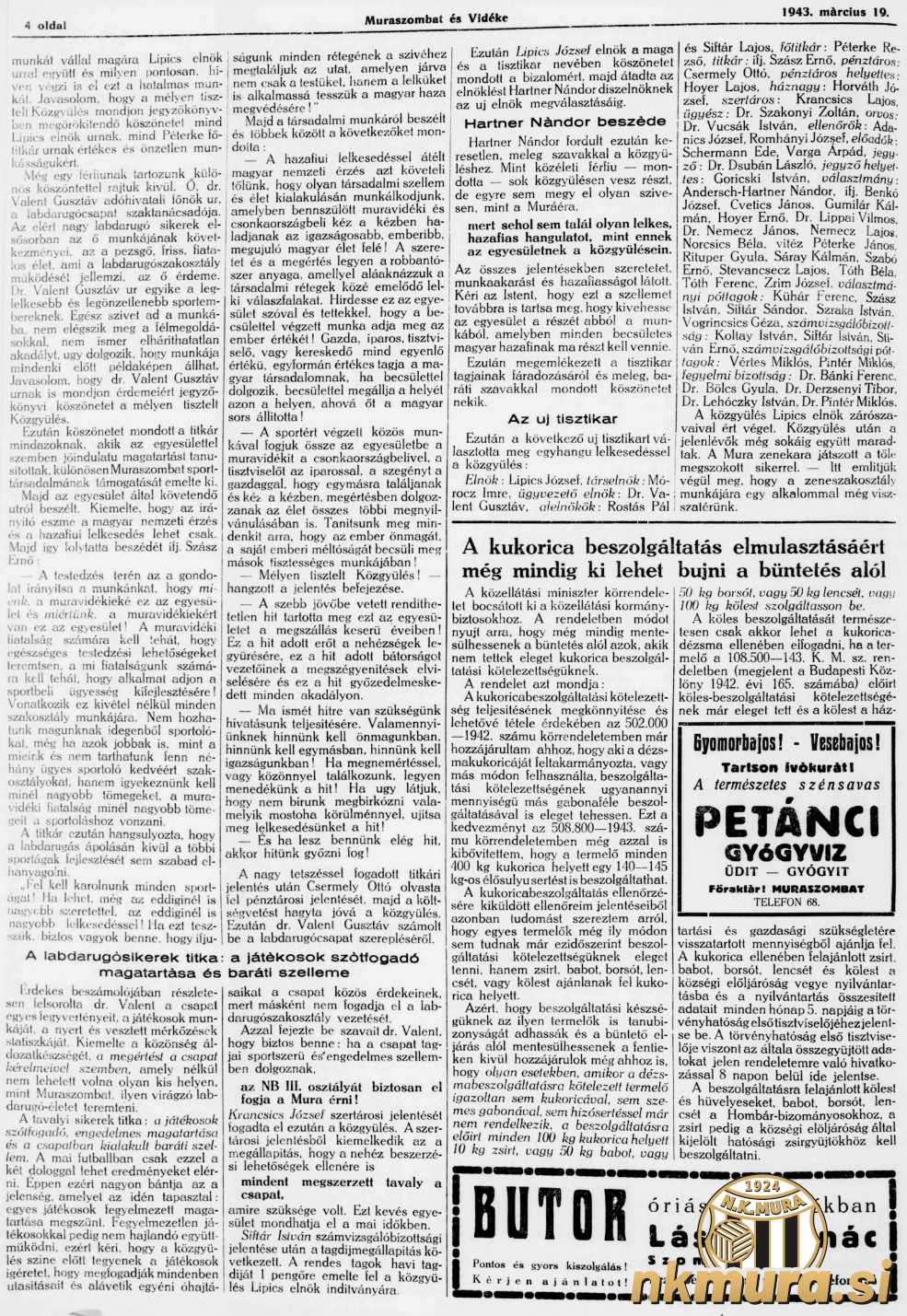 Po poročilu revizijske komisije, ki jo je predstavil Štefan Šiftar je bila določena članarina za leto 1943. Na pobudo predsednika Lipiča le ta znaša 1 pengő. V nadaljevanju občnega zbora se je predsednik Josip Lipič zahvalil članom za podporo in predal besedo Nandorju Hartnerju, ki je nadaljeval občni zbor.