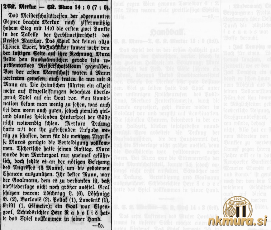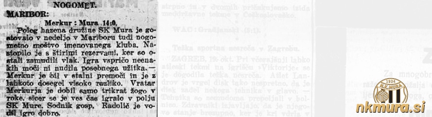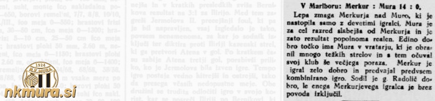 Nogometaši Mure so se v Mariboru pomerili z Merkurjem in izgubili z visokih 14:0. Ob polčasu je bilo 7:0. Merkur je s tem osvojil prve točke v letošnjem prvenstvu. Za domačine so zadeli L. Löischnigg (6 zadetkov), B. Löschnigg (2 zadetka), Barlovič (2 zadetka), Kristl (2 zadetka, od tega enega iz enajstih metrov) in Lunežnik (1 zadetek). En zadetek so si muraši zabili sami.