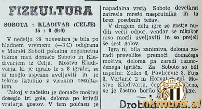 Nogometaši Sobote so v slovenskem polfinalu za pokal maršala Tita gostili celjski Kladivar in se z rekordno zmago 15:0 uvrstili v slovenski finale. Ob polčasu je bilo 9:0. Tekma je bila odigrana v zelo hladnem vremenu, saj so bile v Murski Soboti -3 stopinje Celzija.