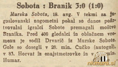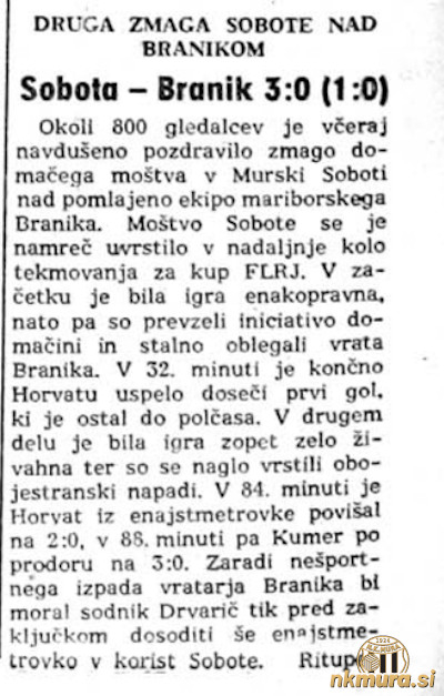 Nogometaši Sobote so včeraj v pokalu maršala Tita gostili mariborski Branik in zmagali s 3:0 (1:0). Z zmago so se uvrstili v naslednji krog.