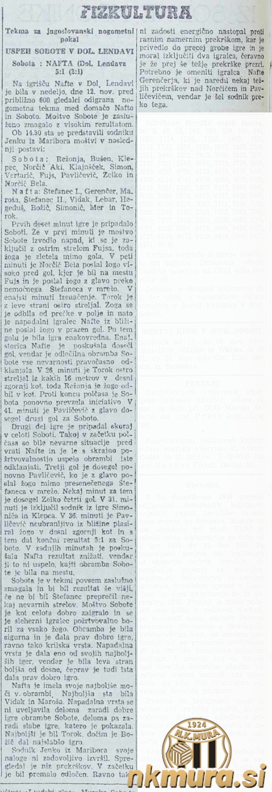 Nogometaši Sobote so v Lendavi igrali slovenski finale za pokal maršala Tita in zmagali z 1:5 (1:2). Naši nogometaši so se z zmago uvrstili med 64 najboljših ekip v Jugoslaviji in bodo tekmovanje nadaljevali na državnem nivoju.