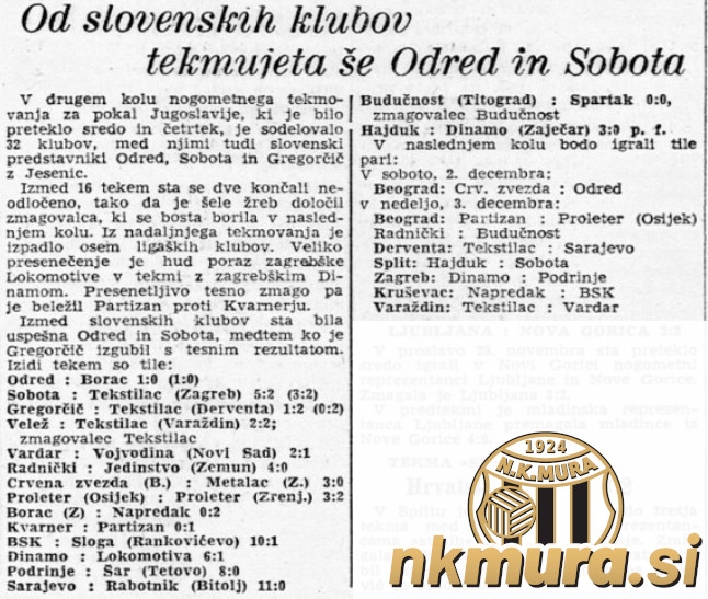 Nogometaši Sobote so se v 1/16 finala pokala maršala Tita pomerili z zagrebškim Tekstilcem in zmagali s 5:2 (3:2). Z uvrstitvijo v osmino finala so dosegli enega največjih uspehov v 26. letni zgodovini kluba. Drugega decembra se bodo v Splitu pomerili z aktualnim državnim prvakom Jugoslavije, Hajdukom.