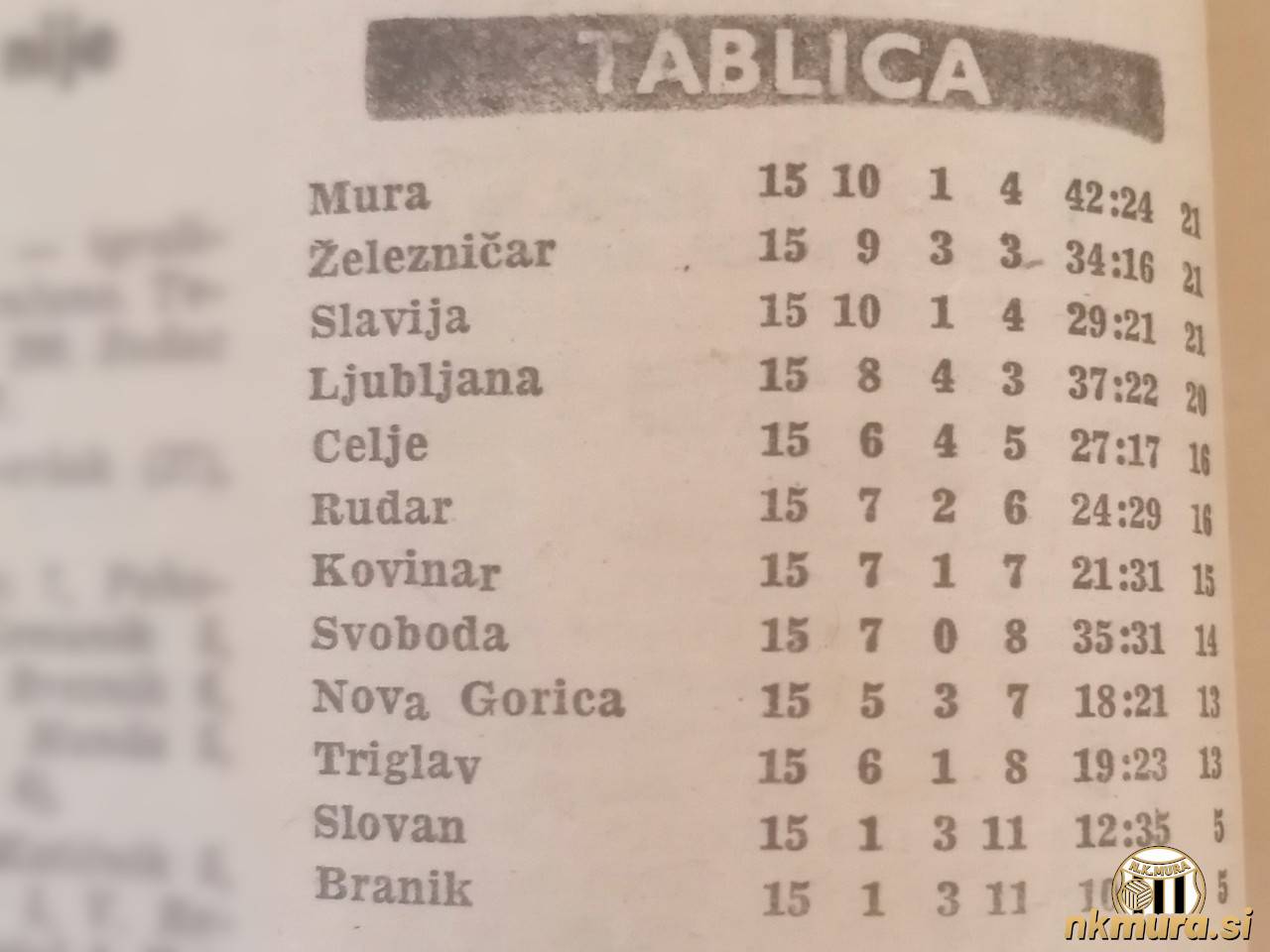 Lestvica po 15. krogu SNL v sezoni 1966/67. Avtorske pravice: nkmura.si Foto: Sportske novosti