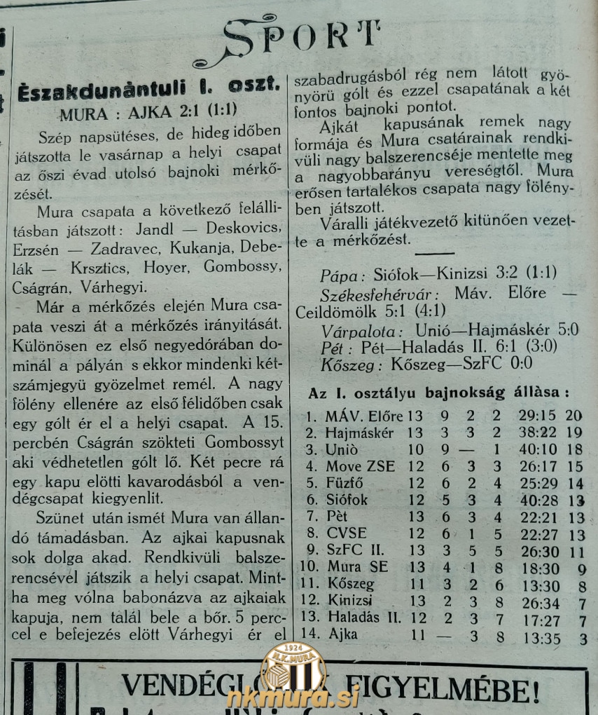V nedeljo, 30. novembra je Mura igrala zaostalo tekmo 4. kroga, ki je bila obenem tudi zadnja v jesenskem delu sezone 1941/42. Črno-beli so zadnjeuvrščeni Ajkai premagali z 2:1. Polčas se je končal 1:1.